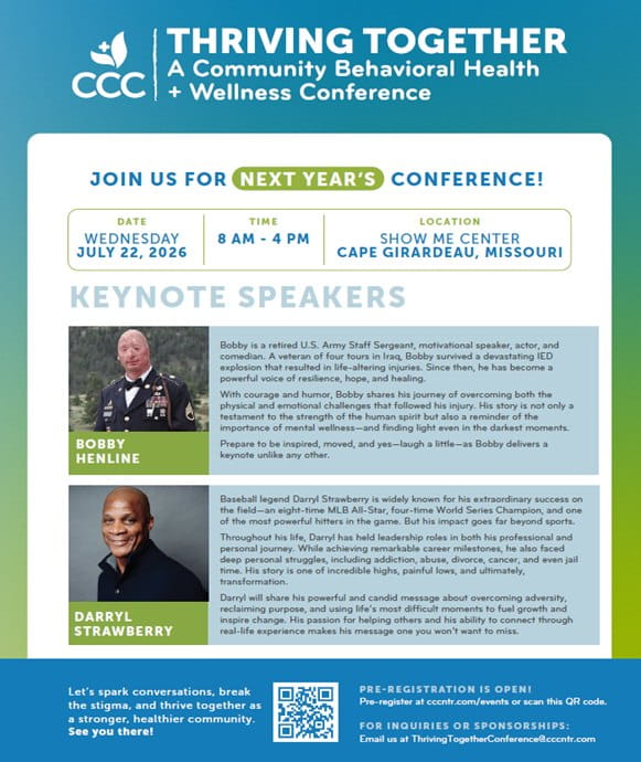 Hosted by the Community Counseling Center (CCC), this event features inspiring national keynote speakers and engaging breakout sessions with practical tools to support behavioral health and mental wellness.